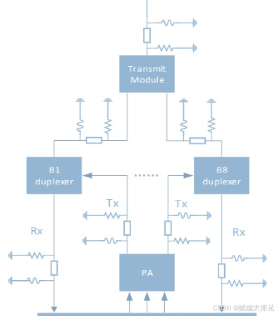 TX:信号从基带芯片发出,然后经过transceiver将信号调制,再经过PA对信号进行放大,然后经过各个不同band的双工器将上行信号送到Transmit module,在Transmit module中进行开关切换、选择,然后发射出去。