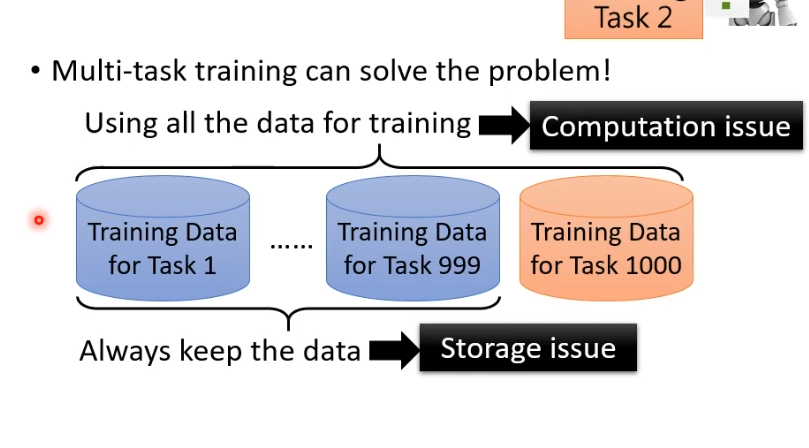 我们也发现如果把任务都混在一起学习就能解决问题,假设要让机器学习第1000个任务,为了避免遗忘就需要把前面999个任务的资料都拿出来混合在一起学习,才能同时学会1000个任务,这样会导致存储的问题,也会导致训练的时间过长。