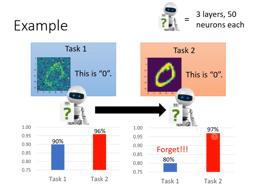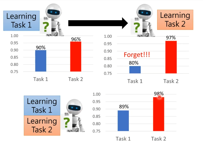 假设把任务1和任务2的资料混合到一起会得到任务1的正确率为89%,任务2的正确率为98%。可以发现机器不是不能掌握两个任务,但是新的任务学会就“忘记”旧的任务怎么做。这叫做catastrophic forgetting。