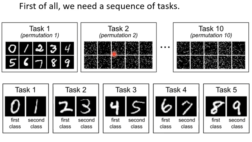 评估life long learning好不好,首先需要一堆任务让机器可以依次学习,常见的是做数字辨识,如下图所示,后续的任务都是数字辨识,只是将数字以某种方式打乱,或者是任务1学习分辨0和1,任务2学习分辨2和3等。