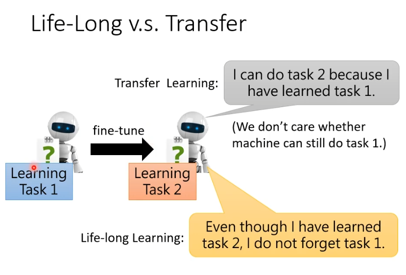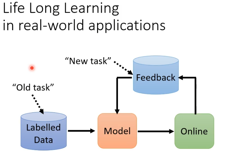 假设某个模型训练好上线后,会得到用户的反馈,把反馈作为新的资料用于更新我们模型的参数,更新后继续收集反馈,再次更新如此循环,模型会越来越好,可以把旧资料做为过去的任务,新的资料作为新的任务,这就是life long learning(LLL)问题。