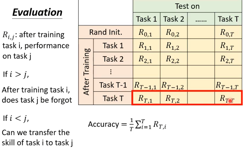 评估的方法是,一排的任务和每次学习之后的正确率(包括初始的随机参数正确率)列出如下图的表格,表中正确率表示为,i代表学习了第几个任务后的正确率,j代表在第几个任务上的正确率,如果i>j(下三角),正确率对应表示是否忘记之前学习的内容,如果i<j(上三角),正确率表示机器transfer的能力。最常见的评估方法是将最后一次的所有任务正确率平均起来代表life long learning的好坏。