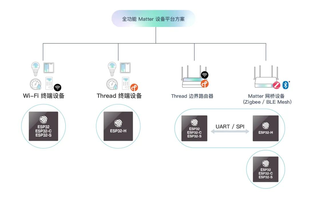 - Wi-Fi终端设备:乐鑫支持Wi-Fi的ESP32、ESP32-C和ESP32-S等系列SoC和模组,均可用于开发Matter over Wi-Fi终端设备。