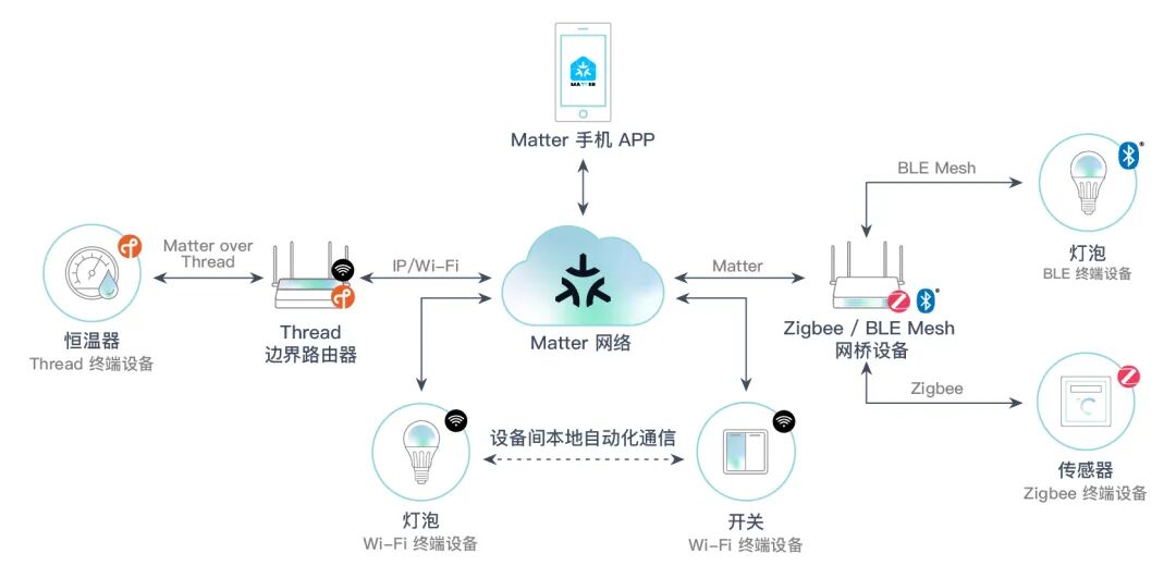 Matter基于IP连接协议,支持通过Wi-Fi、以太网和Thread进行数据传输,并利用Bluetooth LE完成设备的简易配网。