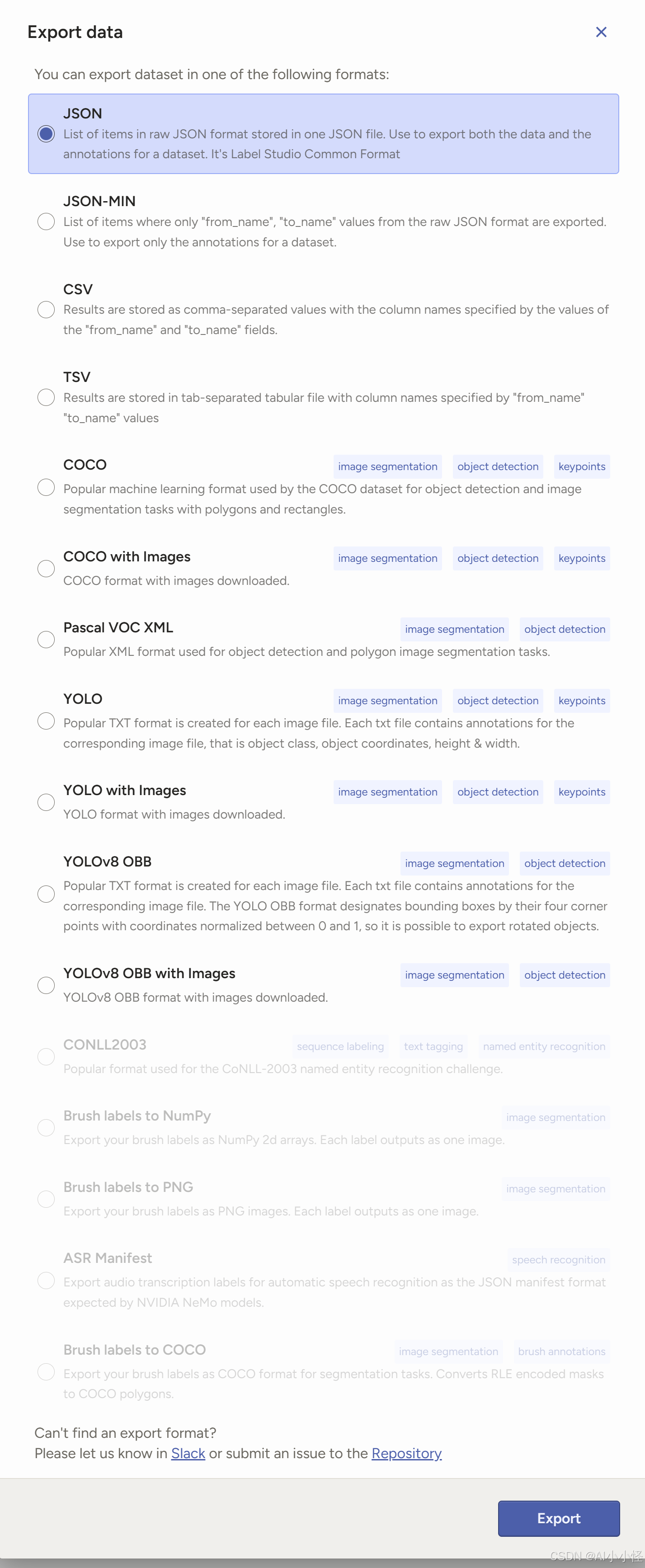 Label Studio 是一个开源的数据标注工具。它允许您通过简单直观的 UI 标注音频、文本、图像、视频和时间序列等多种数据类型,并可以导出为各种模型格式。它既可以用于准备原始数据,也可以改进现有的训练数据以获得更准确的 ML 模型。