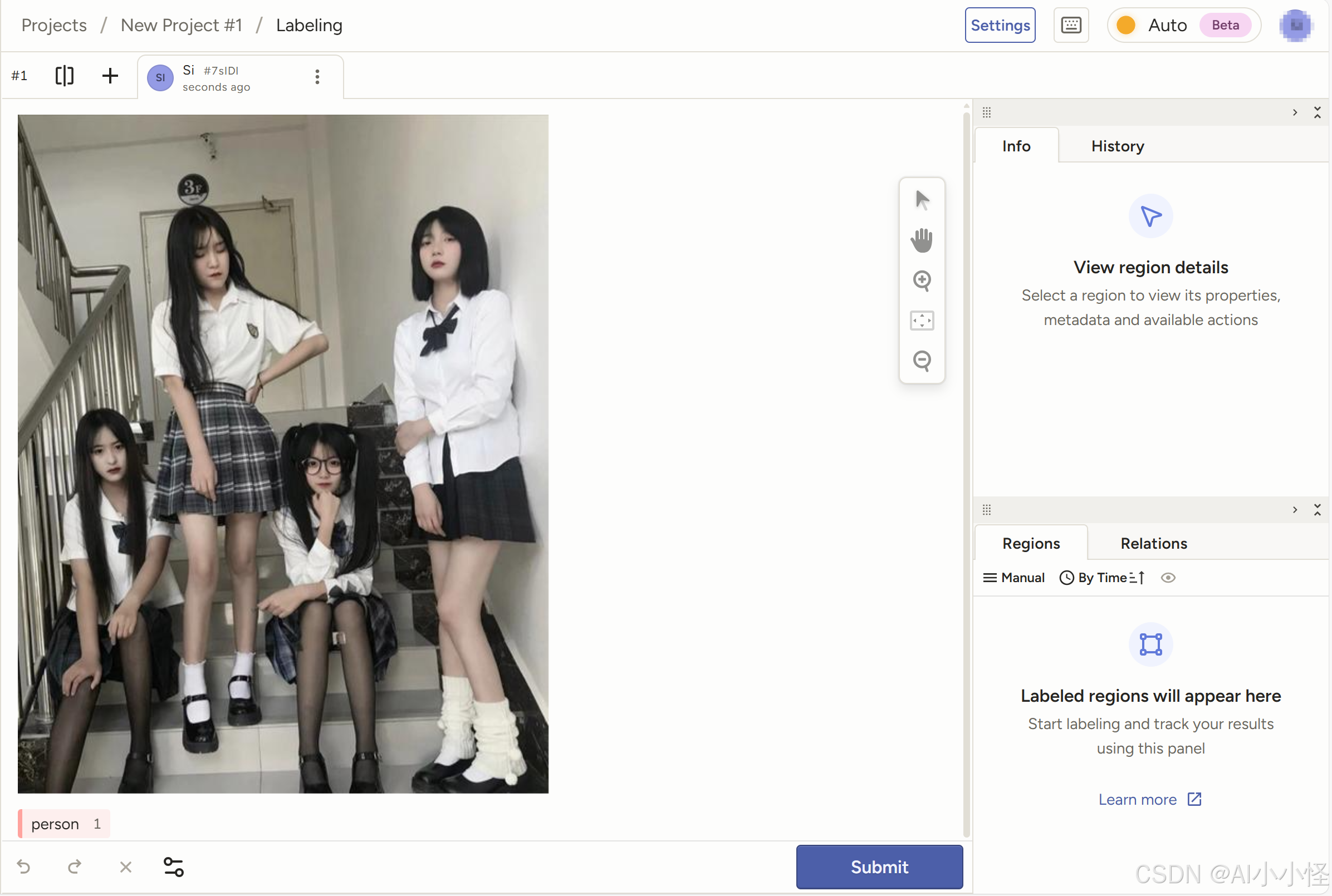 该界面左侧是我们要标注的图像,右侧会显示标注点的信息,这里先点击一下左下角的person标签,而后就可以在图像中人头的部位通过点击来进行标注了。整张图的人头都标注完成后,要点击下方的Submit提交已标注的数据,随后就会跳到下一张图像的标注界面。