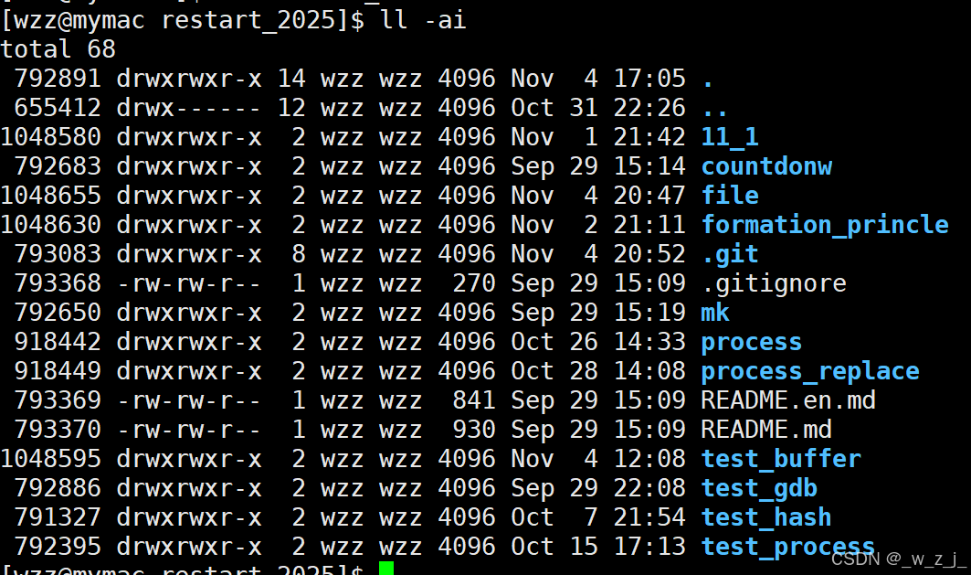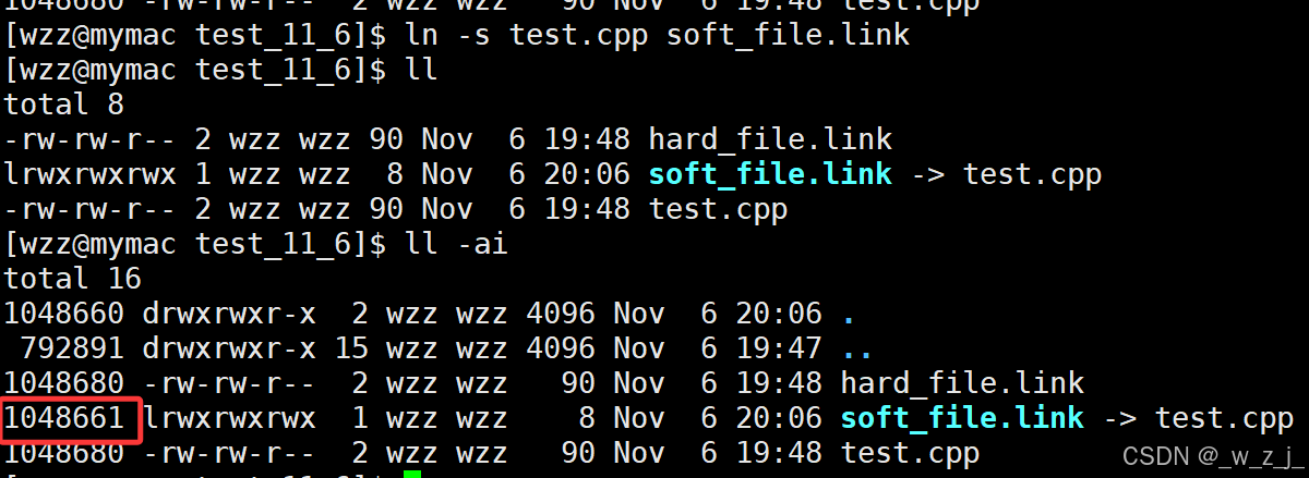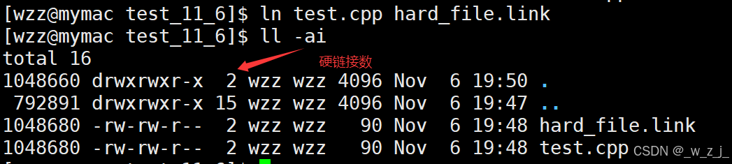 发现test与hard_file的inode一样。其中.表示当前文件夹,为什么会有两个硬链接数呢?因为test_11_6这个文件名与.对应的文件名都硬链接到一个inode!..也是一个道理,上层文件夹。inode结构体中引用计数与硬链接数一致。