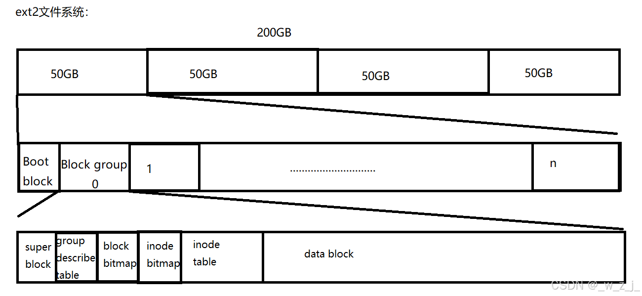 先组织,再描述,文件系统 被格式化为一个块组(block group)的集合,每个块组都有自己的 inode 表 和 数据块。这些 inode 和数据块都属于同一个文件系统,文件系统管理着它们的分配和使用。将200GB的磁盘采用分治的思想管理,也就是常见的C,D,E盘: