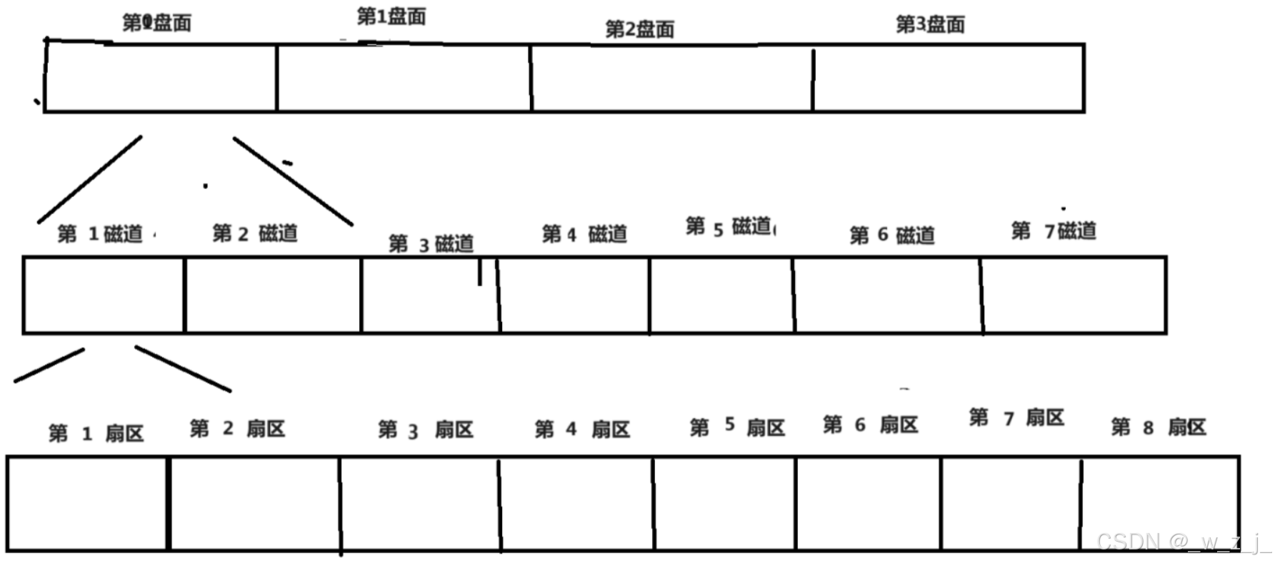 文件被存在磁盘上,通过定位磁盘,柱面,磁道,扇区,可以定位任意一个文件所在的位置。,采用CHS硬件定位法。可以将存储结构其抽象成数组: