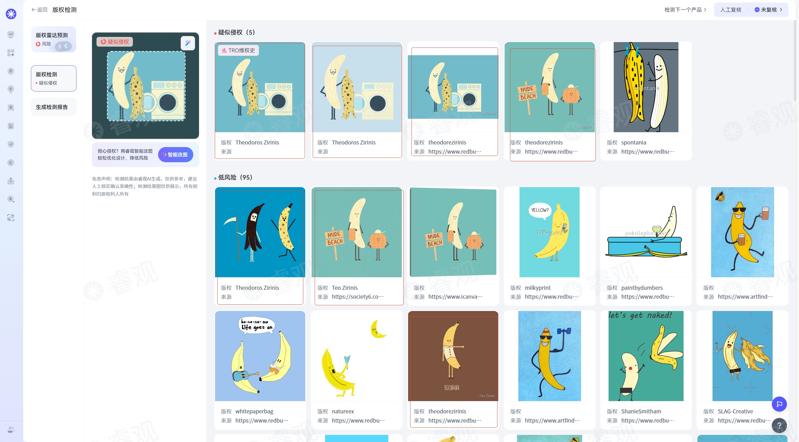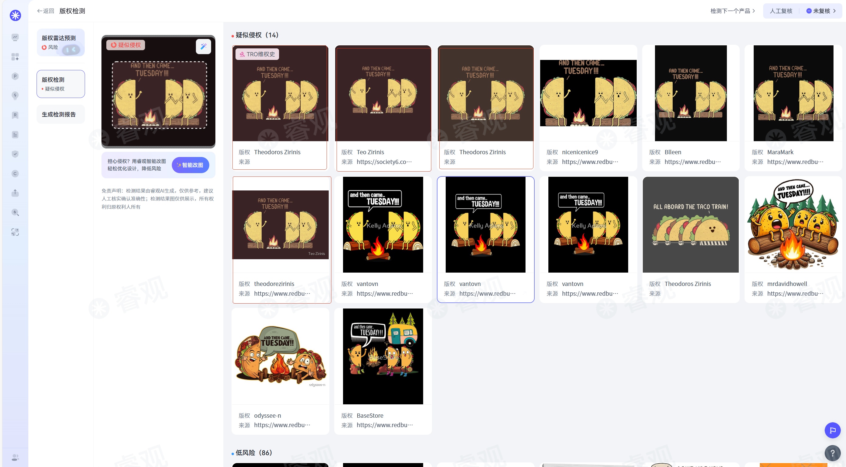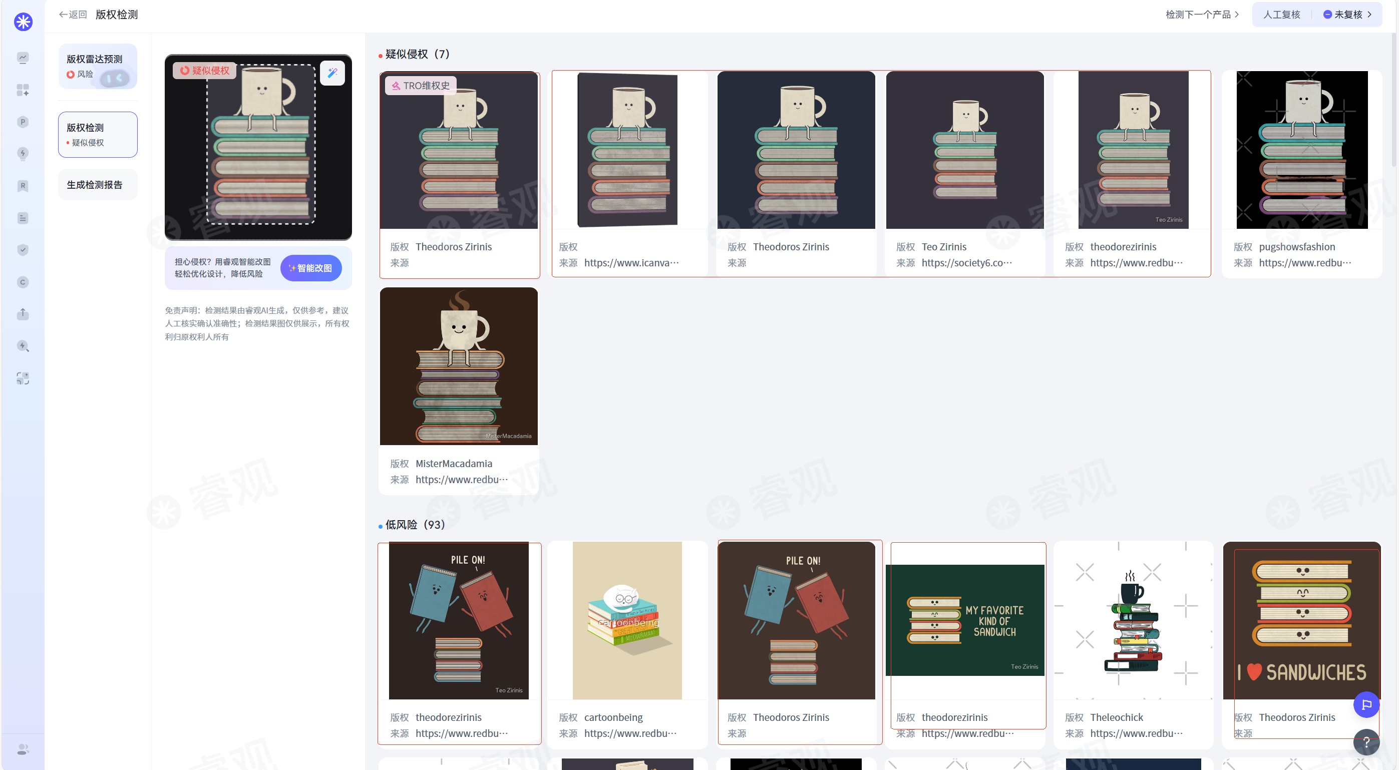 通过睿观独家自研的版权检测功能发现该插画家除了以上版权图之外,名下还有多幅原创版权画作,请卖家朋友尤其注意!尽早下架相关产品,避免侵权。