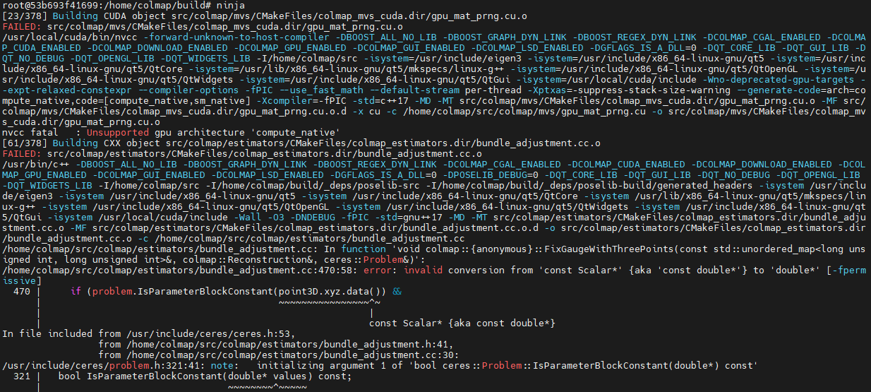 Colmap 代码与你系统中安装的 Ceres Solver 版本不兼容—— 旧版本 Ceres 的 IsParameterBlockConstant 函数参数为非 const 指针,而 Colmap 新版本代码中 point3D.xyz 是 const 类型,导致类型冲突。