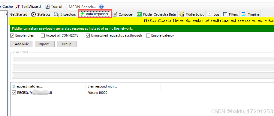 备注:有时 CustomRules.js添加延时代码不生效;需要在 AutoResponder 中点击 Add Rule,在 Rule Editor 中粘贴 URL,前面加上 EXACT;或者(去掉复杂的域名匹配,只匹配 URL 路径)。
