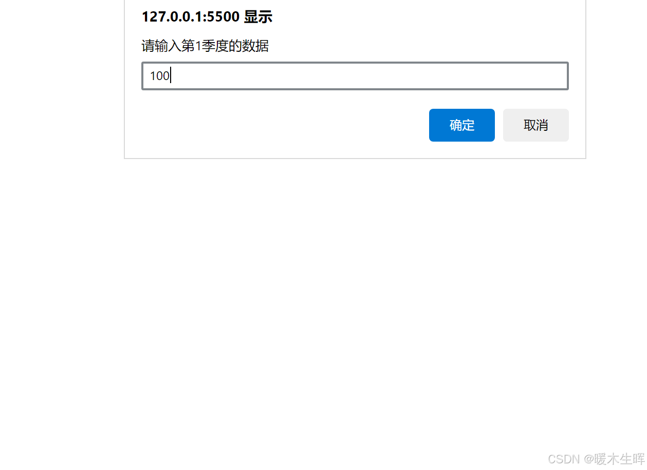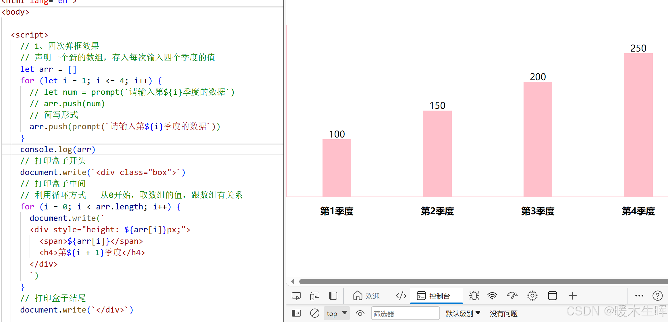 </head><body><script>// 1、四次弹框效果// 声明一个新的数组,存入每次输入四个季度的值let arr = []for (let i = 1; i <= 4; i++) {// let num = prompt(`请输入第${i}季度的数据`)// arr.push(num)// 简写形式arr.push(prompt(`请输入第${i}季度的数据`))}console.log(arr)// 打印盒子开头document.write(`<div class="box">`)// 打印盒子中间// 利用循环方式 从0开始,取数组的值,跟数组有关系for (i = 0; i < arr.length; i++) {document.write(`<div style="height: ${arr[i]}px;"><span>${arr[i]}</span><h4>第${i + 1}季度</h4></div>`)}// 打印盒子结尾document.write(`</div>`)</script>