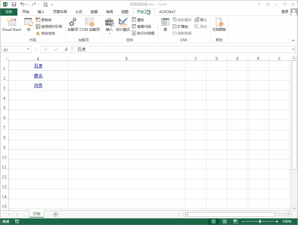Microsoft Excel怎么批量快速提取单元格内的超链接地址?1、启用【开发工具】。首先左键单击菜单栏中的【文本】选项卡,然后左键单击【选项】,左键单击【Excel 选项】中的【自定义功能区】选项,然后将【开发工具】前的小方格打上对勾,然后左键单击【确定】按钮,此时菜单栏中对多出一个选项【开发工具】。