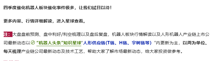 注:小编“机器人头条”知识星球“人形供应链专栏每天都会对大盘行情进行详细梳理,包括盘前预测、盘中利好/利空梳理以及盘后复盘,并梳理T链重点利好资讯和企业,为大家投资做参考。