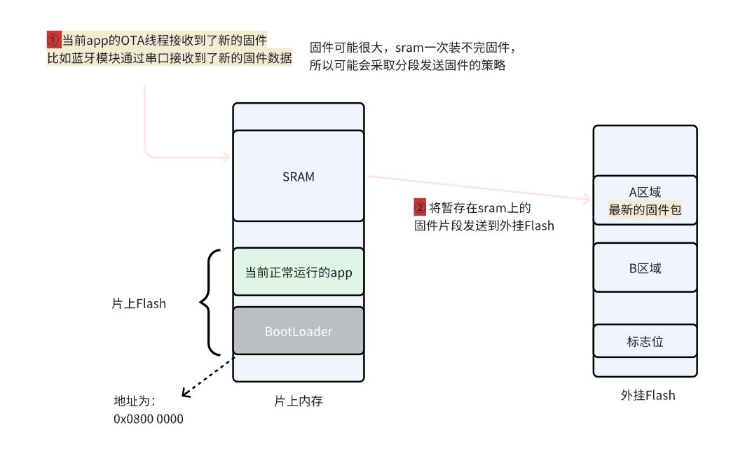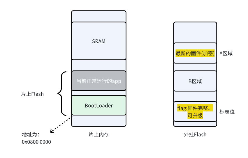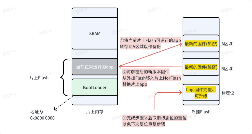 现在就可以将解密后的最新固件加载到片上Flash中了。另外,为了防止最新固件无法正常运行,还需要做一个版本回溯机制,即将当前片上Flash中的可正常运行的app暂存起来,存储到已完成使命的外挂Flash中A区域。