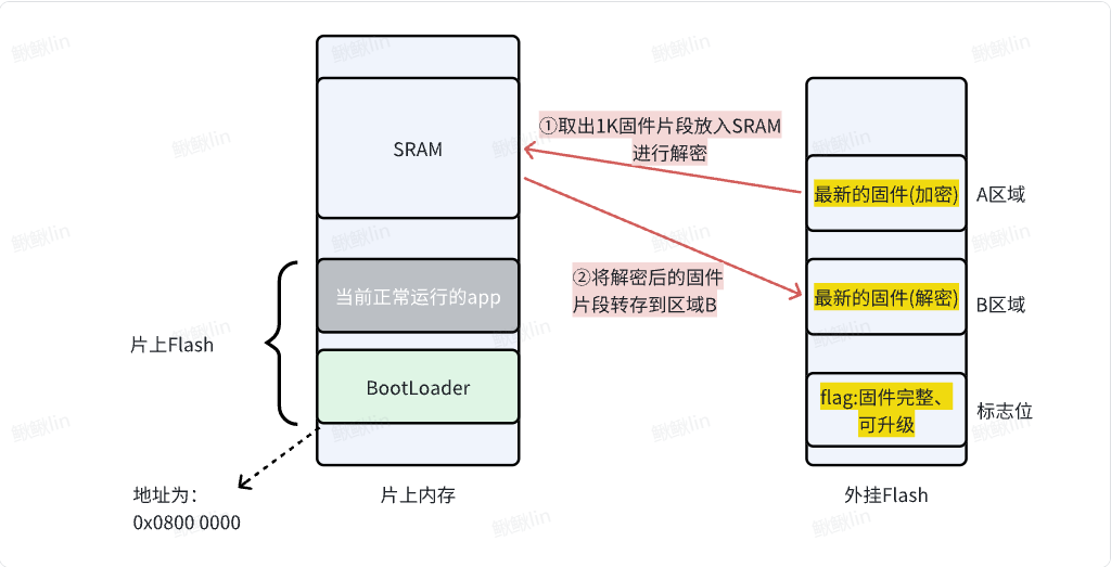 在BootLoader中会检查外挂Flash中的标志位,若标志位表明当前有可更新的固件则BootLoader会执行固件升级的逻辑。此时首要的任务是将外挂Flash中A区域的加密固件解密,将解密后的固件转存到外挂Flash的B区域中。