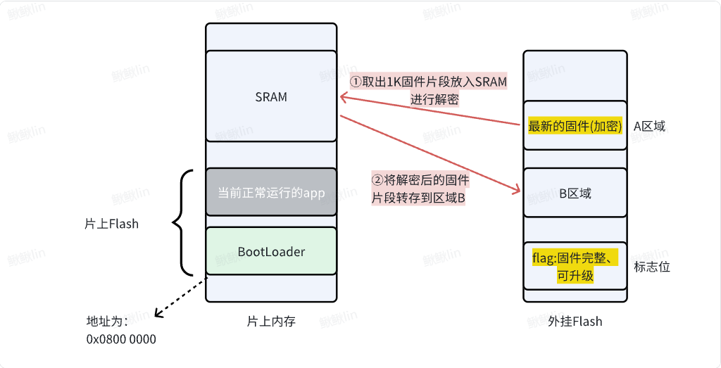 1.Bootloader将A区域的固件一部分一部分地解密并放到B区域。由于SRAM一般很小,不可能装下一整个固件,所以采用每次处理1K的方式,与Flash的擦除单位相匹配,提高了操作的效率和灵活性。