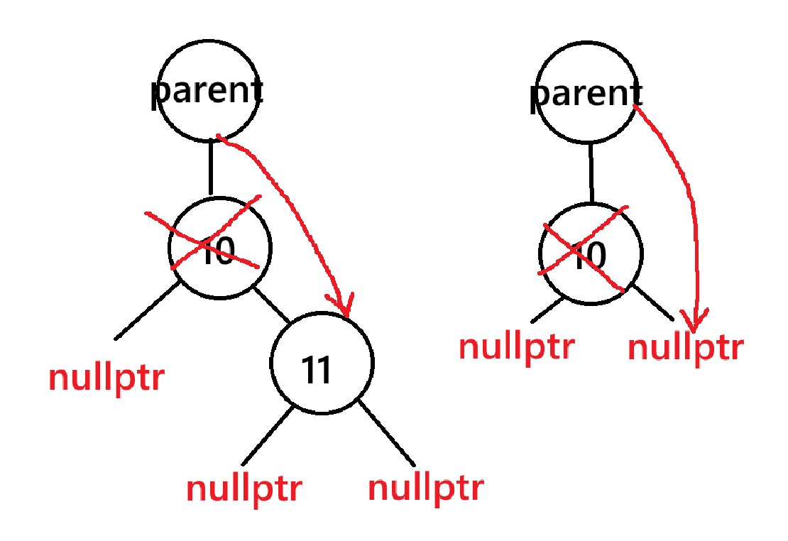这两种情况都可以满足,在判定 cur 是 parent 的左孩子还是右孩子后,进行删除,只不过第二种情况的右孩子是 nullptr 罢了