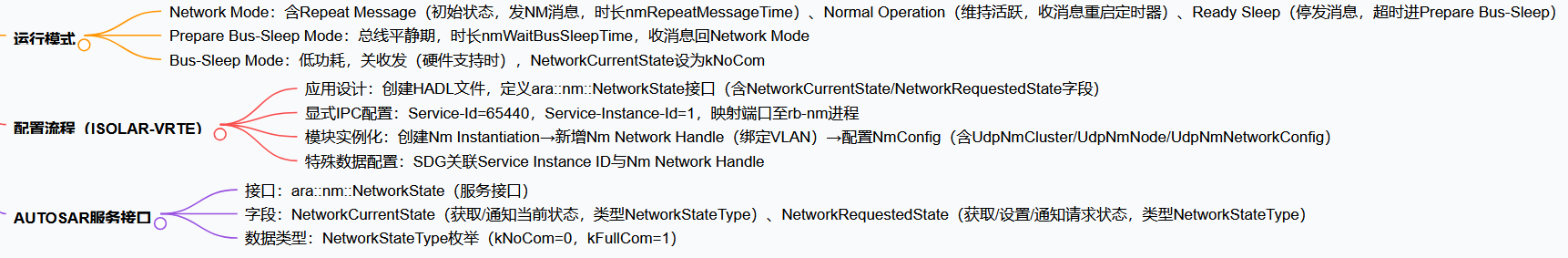网络管理(NM) 是 AUTOSAR 自适应平台服务的功能集群,核心基于去中心化 UdpNm 算法,通过周期性 UdpNm 消息协调网络节点在Network Mode(含 Repeat Message/Normal Operation/Ready Sleep 三个内部状态)、Prepare Bus-Sleep Mode、Bus-Sleep Mode 间切换;