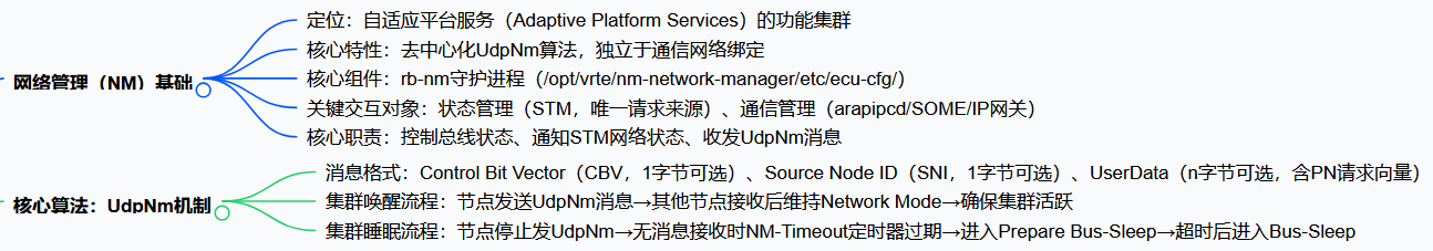 其核心职责包括控制网络总线状态、通知状态管理(STM)网络状态、收发 UdpNm 消息激活节点,需通过rb-nm 守护进程(依赖通信管理组件启动)实现功能,配置需在 ISOLAR-VRTE 中完成(含应用设计、显式 IPC 服务配置、模块实例化),并通过ara::nm::NetworkState 接口(含 NetworkCurrentState/NetworkRequestedState 字段)与 STM 交互,不直接面向普通自适应应用。
