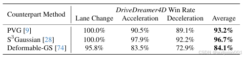 表 3 不同新颖轨迹视图合成中DriveDreamer4D的优选率