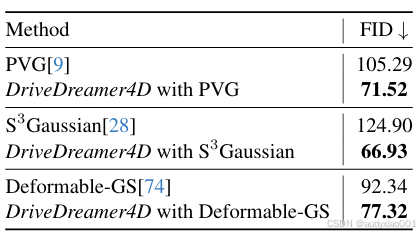 除验证新颖轨迹渲染的时空一致性外,文中还利用FID指标评估新颖轨迹下的渲染质量。由于加速和减速场景的渲染视角与真实分布相似度较高,FID对算法的区分能力有限,因此FID对比仅聚焦于变道场景。如表2所示,DriveDreamer4D显著优于三种基线方法,FID相对提升分别为32.1%、46.4%和16.3%,证明其提升新颖轨迹视角生成质量的能力。