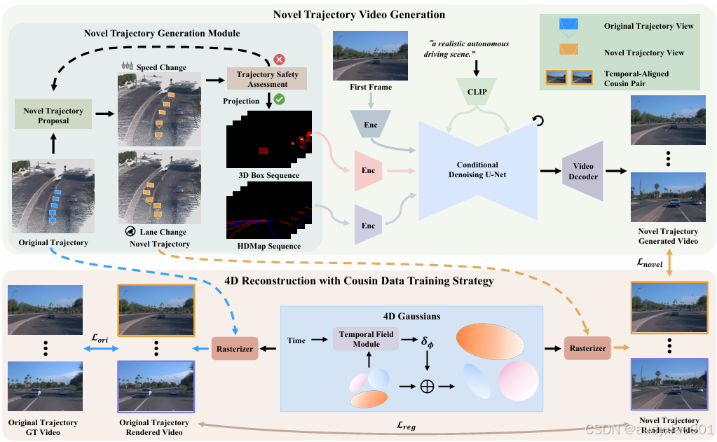 DriveDreamer4D的整体流程如图2所示。在上半部分,提出的新轨迹生成模块通过调整驾驶动作(如转向角、速度)生成新轨迹。这些新轨迹为提取3D边界框、高清地图等结构化信息提供新视角。随后,可控视频扩散模型根据这些更新后的视角合成视频,并融入与修改后轨迹相关的特定先验知识。在下半部分,提出的同源数据训练策略将时间对齐的真实数据与生成数据融合,用于优化4DGS模型,并通过计算正则化损失确保感知一致性。下文将详细阐述新颖轨迹视频生成和4D重建的CDTS策略。
