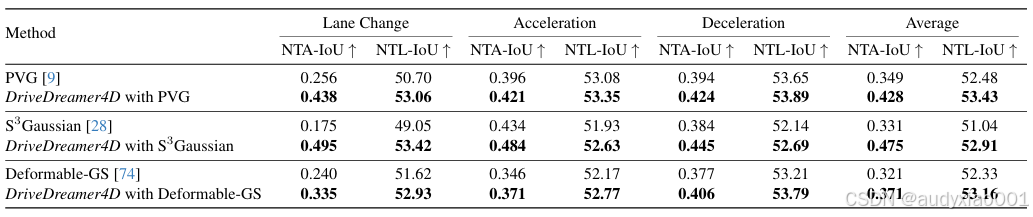 如表1所示,将DriveDreamer4D与不同4DGS算法集成后,在变道、加速、减速等多种复杂机动动作中,NTA-IoU和NTL-IoU得分均持续优于基线方法。具体而言,DriveDreamer4D使三种基线方法(PVG、S3Gaussian、Deformable-GS)的平均NTA-IoU分别相对提升22.6%、43.5%和15.6%,凸显了提升前景智能体时空一致性的能力;同时,三种基线方法的平均NTL-IoU分别相对提升1.8%、3.7%和1.6%,显著增强了驾驶场景4D渲染中背景车道线的时空一致性。