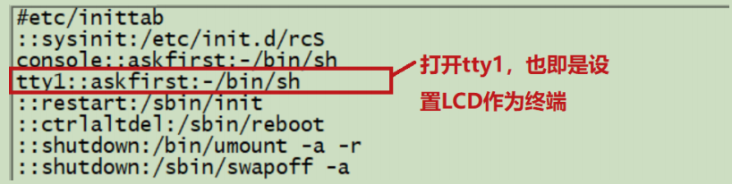 修改完成以后保存/etc/inittab 并退出,然后重启开发板,重启以后开发板 LCD 屏幕最后一
