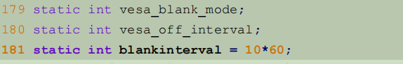 在 Linux 源码中找到 drivers/tty/vt/vt.c 这个文件,在此文件中找到 blankinterval 变量,如下
