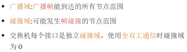 交换机每个接口是独立碰撞域,使用全双工通信时碰撞域为 0
