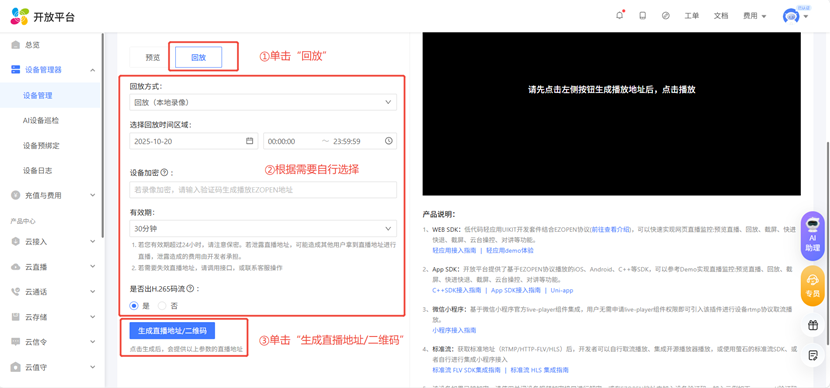 第一步:首先单击“回放”,然后根据自己需要选择回放时间区域等信息,最后单击“生成地址”。
