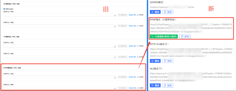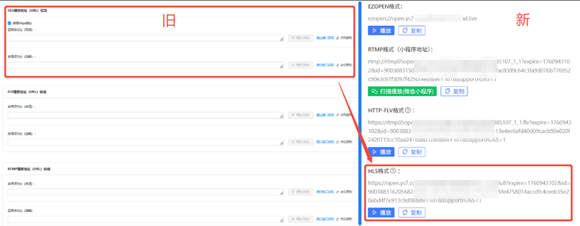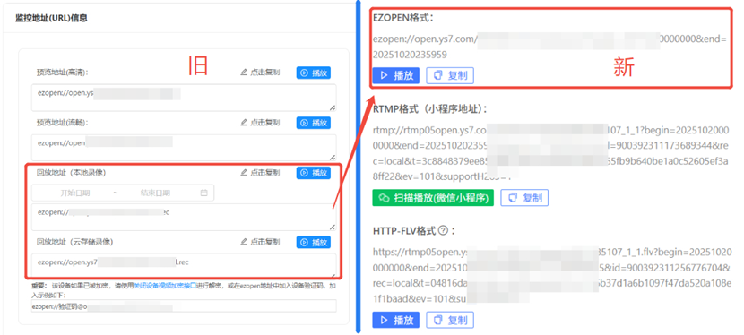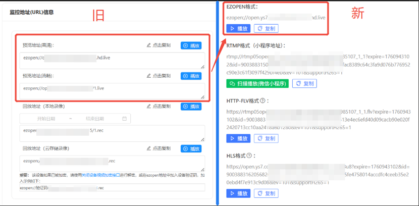 由于新版界面不再区分监控地址和直播地址,因此监控地址如何复制可以见下图所示,左为旧版,右为新版,左侧红框对应右侧红框。