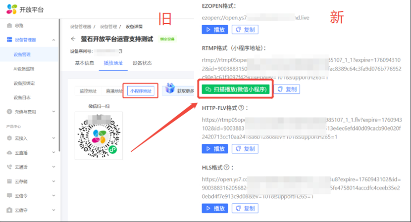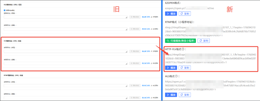 开放平台于2025年9月对控制台的直播页面进行升级,由于新老版本UI界面发生了变化,本文将介绍播放地址的获取方式(1.flv;2.rtmp等等),主要分为预览地址(2.1)、回放地址(2.2)和小程序地址(2.3)。