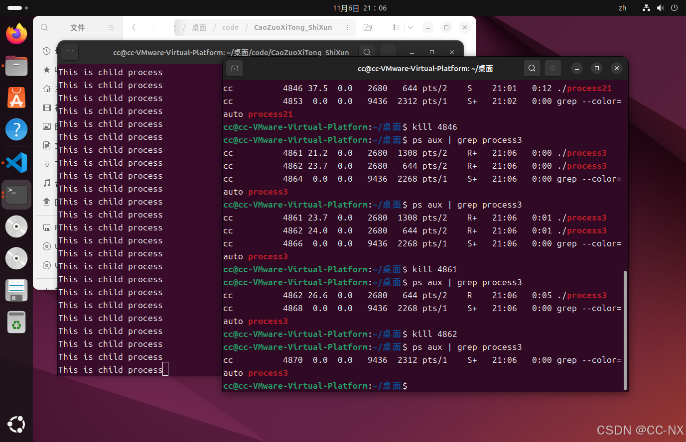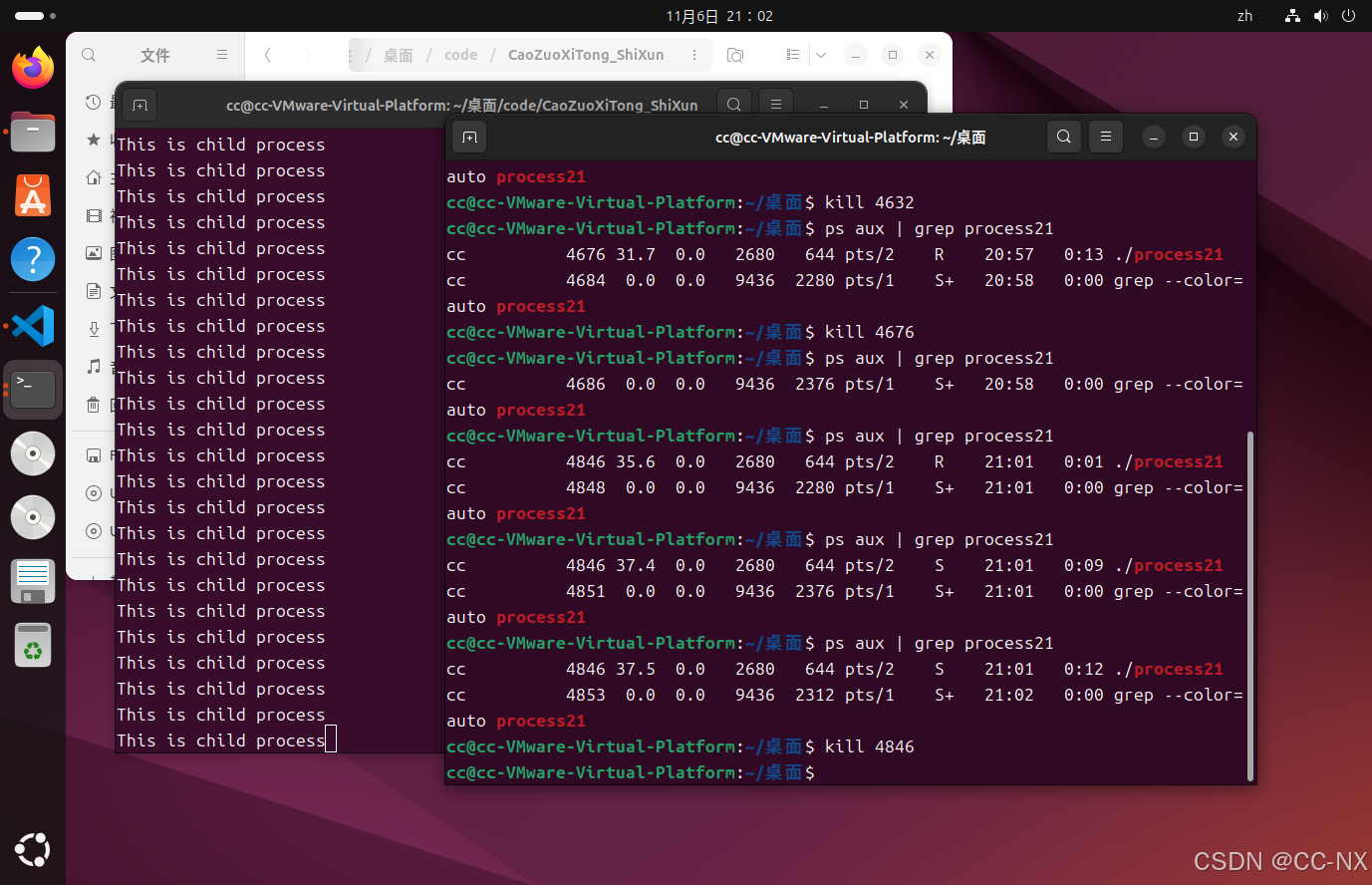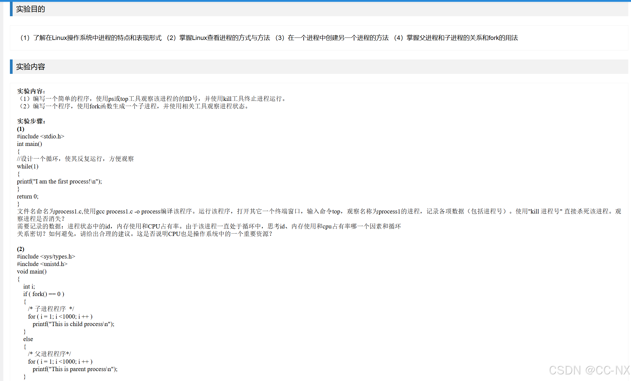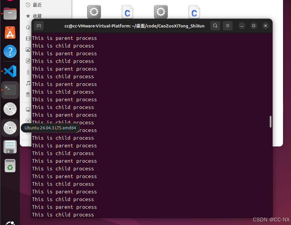 原因:父子进程独立调度,各自占用CPU资源。输出竞争终端,可能出现交错打印。必须手动 kill 两个进程,才能终止。