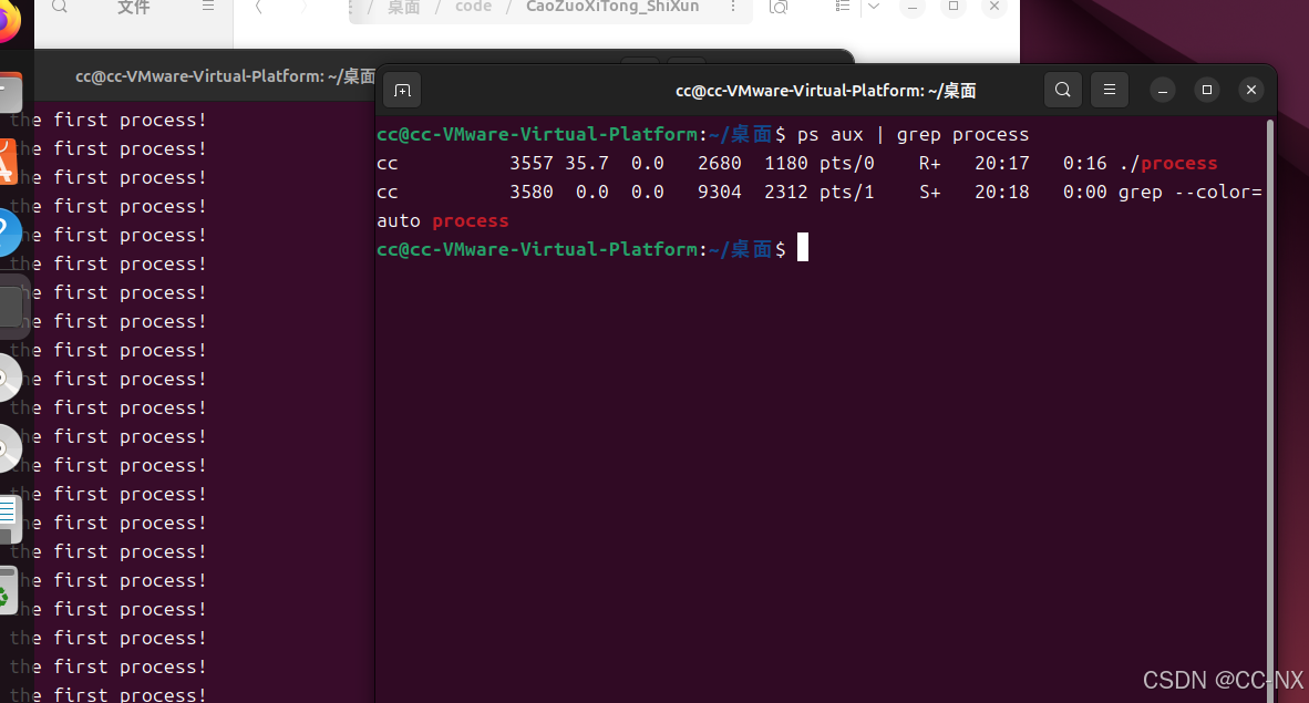 我们可以观察发现两个进程都无限循环。输出交替或混乱,取决于调度。使用 top 可以看到:两个进程,CPU占用率都很高。