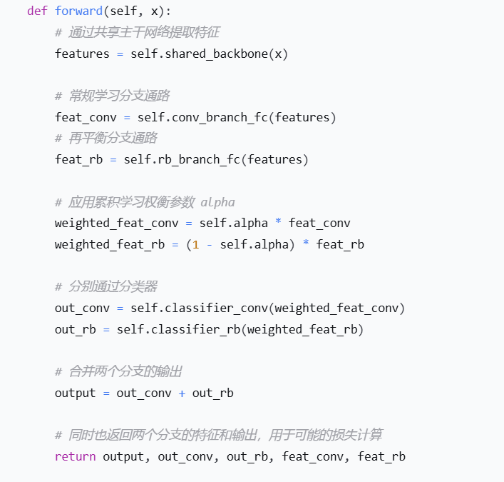 两个分支的特征经过加权(α 和 1-α)后,分别通过它们自己的分类器,然后将输出logits相加,再计算交叉熵损失-6。