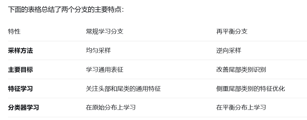 再平衡分支(Re-Balancing Branch):使用逆向采样,更关注尾部类别中的数据,目标是为尾部数据学习更好的特征和分类器,从而缓解类别不平衡。