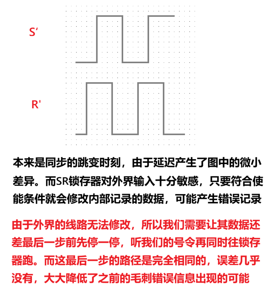 因为锁存器对外界的输入十分敏感,只要输入端S'和R'两端的电平发生了跳变就可能会改变锁存器记录的数值。但是我们无法保证电路通路中是完全没有延迟的,本来理论上同时跳变的信号,可能由于误差使得一端稍稍慢于另一端,而SR触发器这种敏感器件就会对其产生反应,可能就导致记录了错误的数据。所以我们需要有一种能力,使得信号到来时,快的信号稍稍等一等慢的信号,然后同时进入锁存器。
