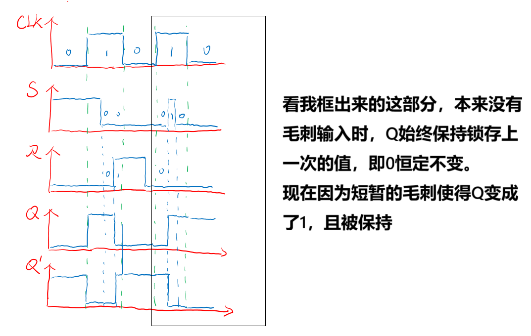 但是仔细观察,似乎第一级在抓取输入信号时,仍然是一个片段,在CLK在=0一定是一个时间片,而不是一瞬间,所以在这个过程中会持续抓取外部输入,如果有毛刺同样可能会修改锁存器记录的值,只要在最后CLK切换前毛刺消失,恢复成原本的电平即不会影响输入的准确性。