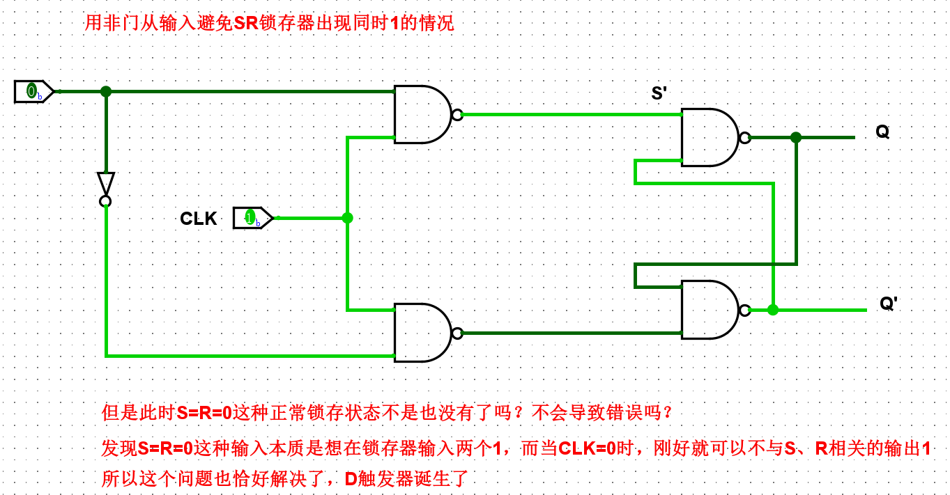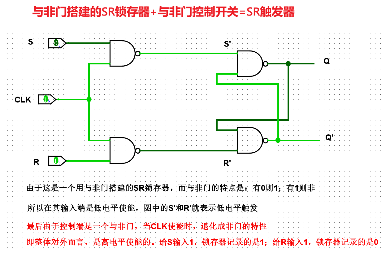 (2)当CLK=0时,与非门控制器恒定输出1,传递到SR锁存器时呈现保持态,也是正常工作的。