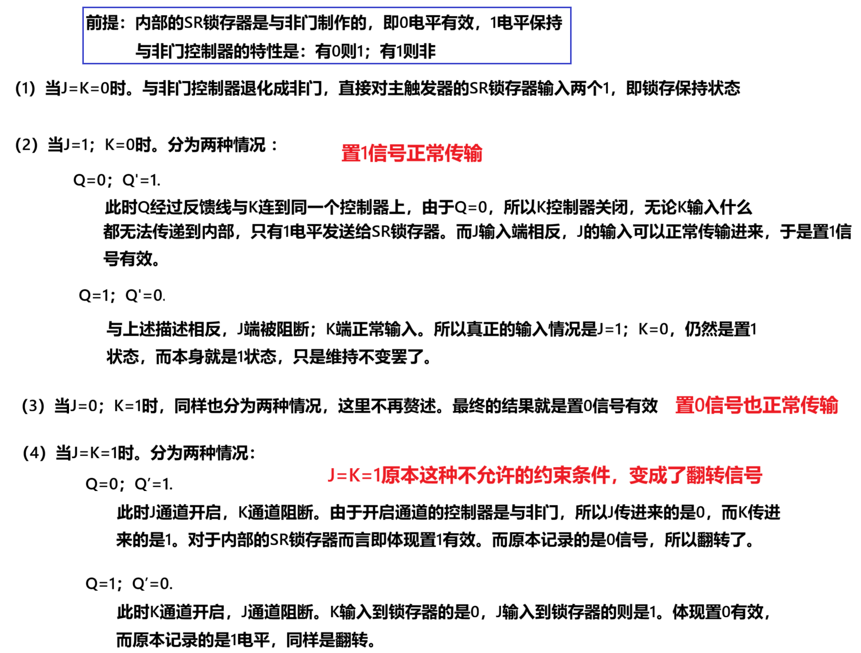 不过需要注意的是:这个总结是在CLK=1期间,J、K两端无任何毛刺情况下才成立,如果任意一方出现了毛刺,则需要具体到器件原理图分析,上述的规律不再适用。