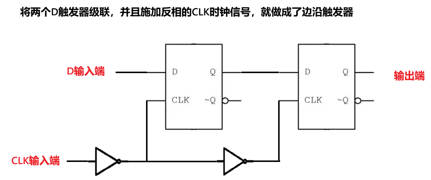如果将上升沿触发的D触发器的两个非门去掉,则退化成了两个SR触发器。用他们做级联就得到了脉冲触发的SR触发器。