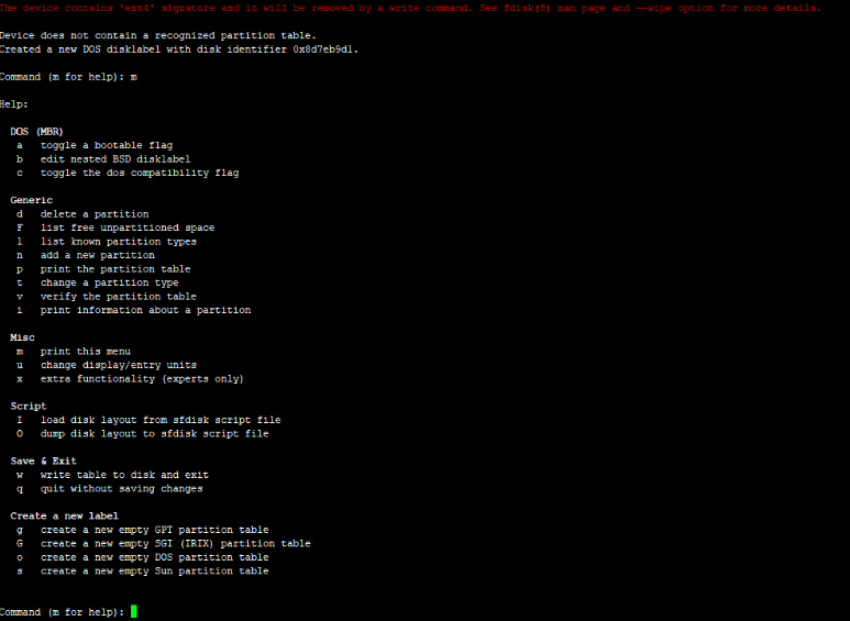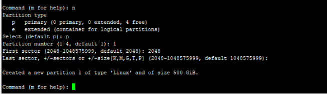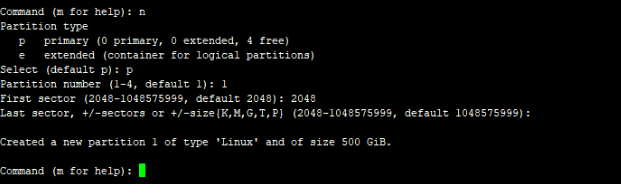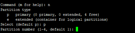 【键入p,创建主分区】,这里没有在根目录下创建过扩展分区,所以创建主分区