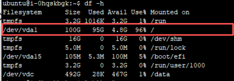 df -h #查看磁盘空间使用情况可以看到根目录下的磁盘空间剩余4.8G,很快就满了。