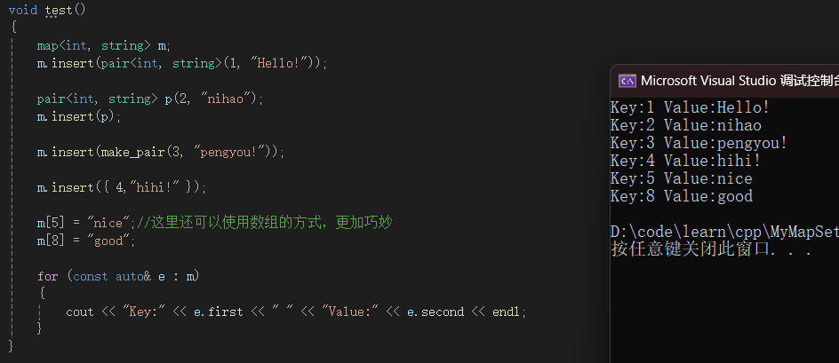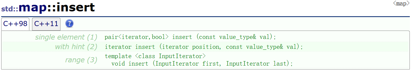 - 当插入成功时,pair 的第一个元素是指向新元素的迭代器,第二个元素是 true;