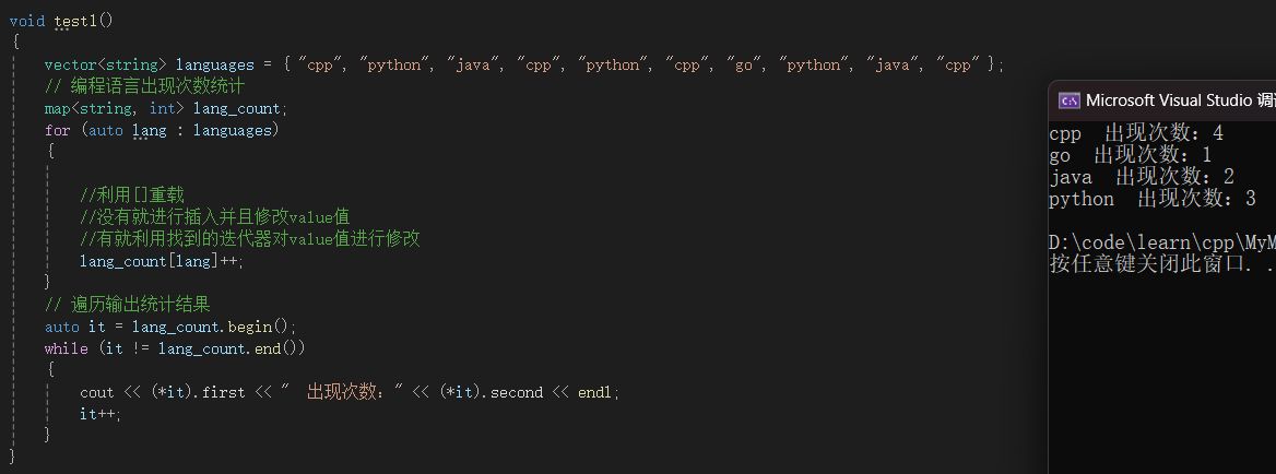 {//是否插入看的是key,不是value//multimap支持key冗余,无论value是否一样multimap<int, string> mul_map;mul_map.insert({ 1, "Hello" });mul_map.insert({ 1, "Hi" });mul_map.insert({ 2,"Hehe" });mul_map.insert({ 3,"nice" });mul_map.insert({ 3,"nice" });cout << "multimap:" << endl;for (const auto& e : mul_map){cout << e.first << " " << e.second << endl;}