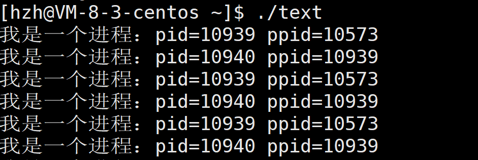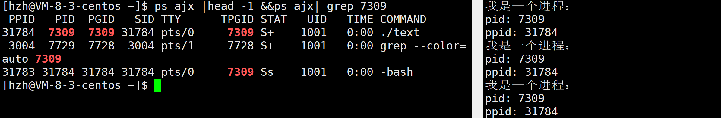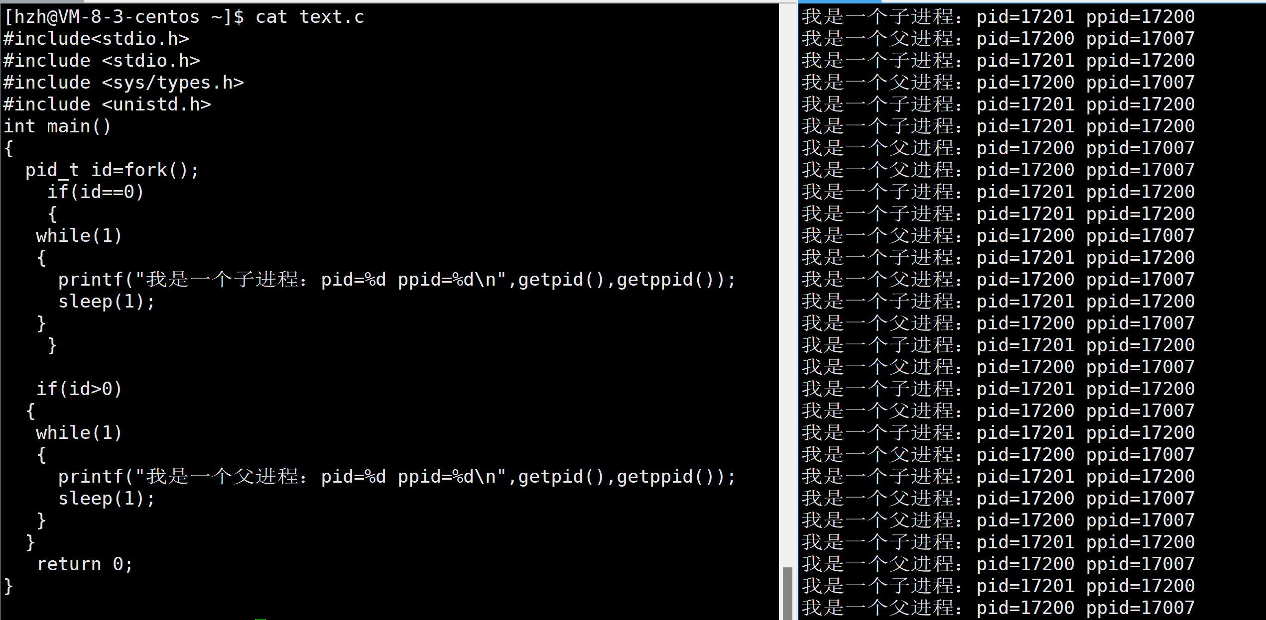 我们可以看到,使用fork函数后可以看到出现了两个进程,并且一个进程是另一个进程的父进程。(这里父进程的父进程的ppid跟之前不同是因为我重启了终端,系统重新分配了bash)